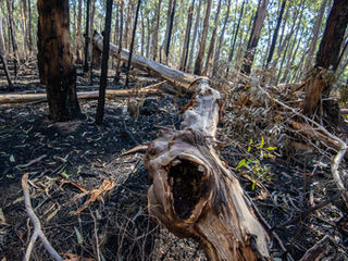 Fire caused significant damage and subsequent collapse of many large old hollow trees across all burnt areas surveyed. Fire is a threatening process to many tree-dwelling species, not only causing direct mortality, but also the destruction of habitat trees used for nesting, feeding and denning. Research by DELWP Report No:95 (Bluff 2016) identified that hollow bearing trees in planned burns were 28 times more likely to collapse than in unburnt areas. The research also found that fire damage to hollow trees was cumulative. If an old hollow tree survived the first fire, basal damage would ensure that the second or third fire, would take them out.
